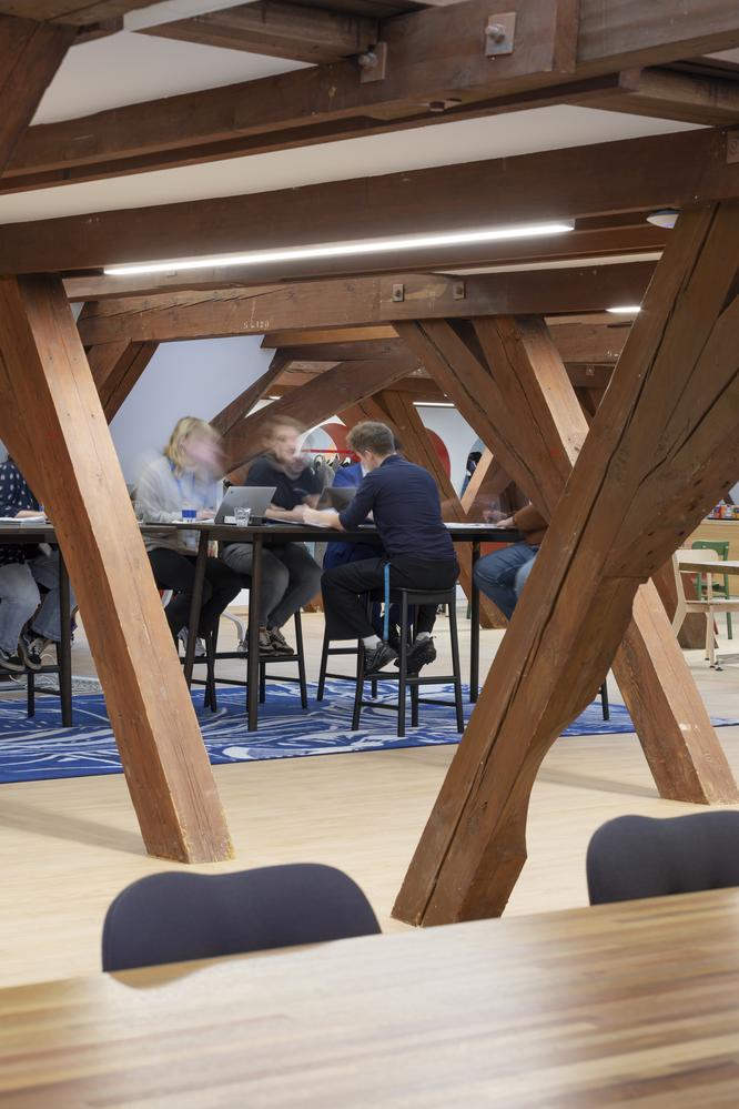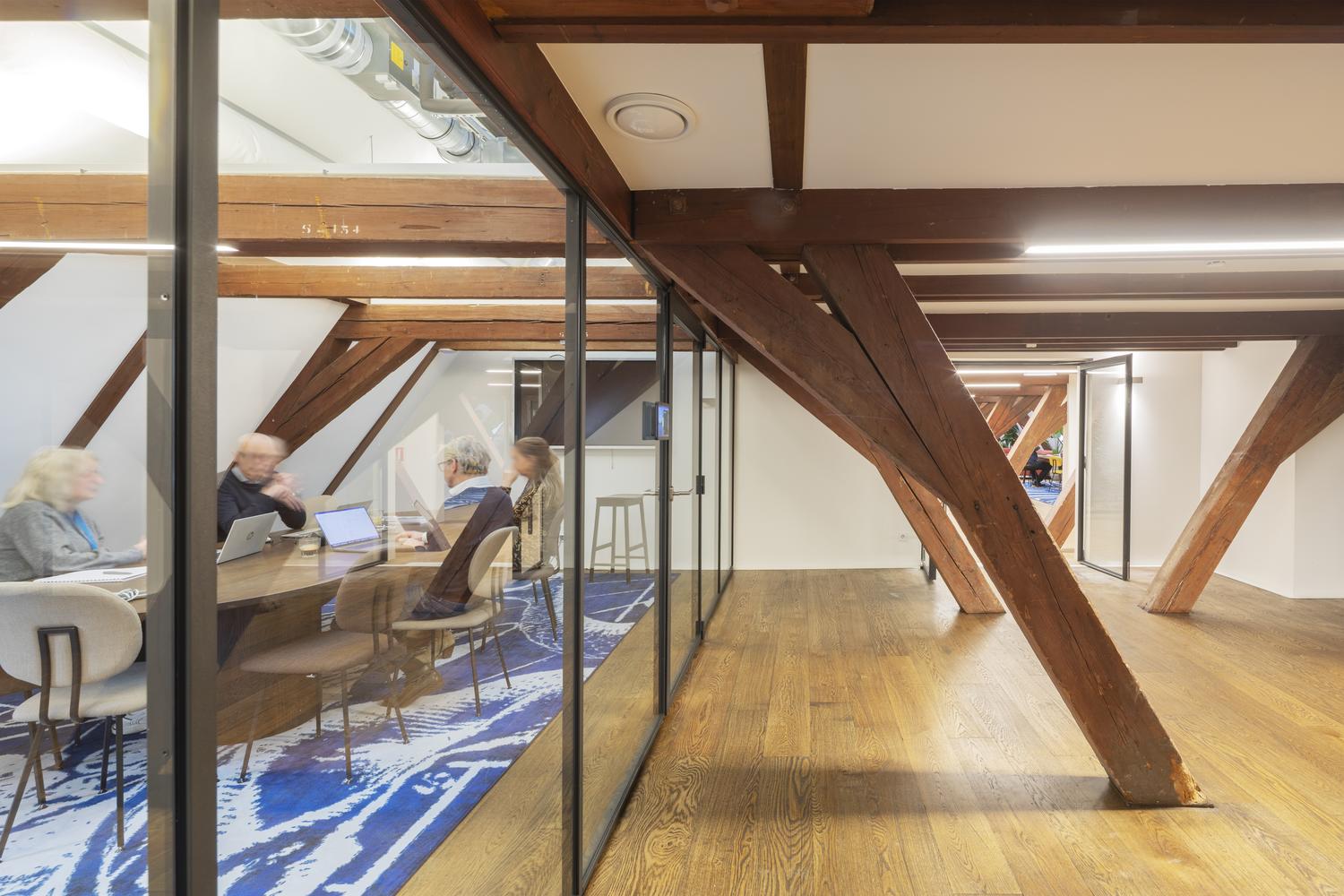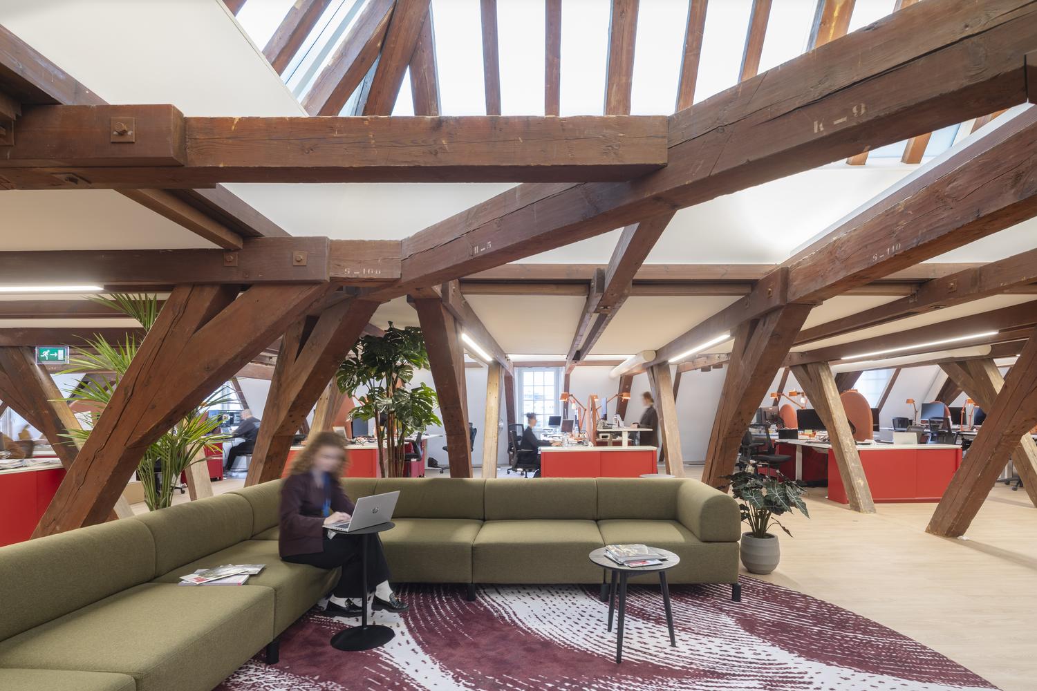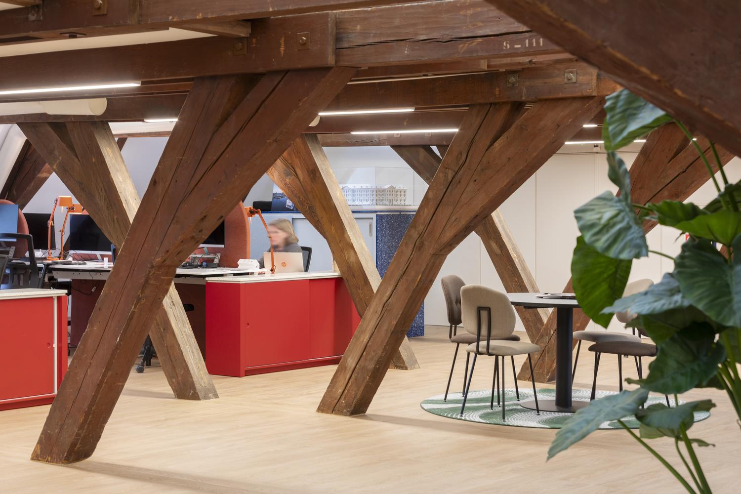 Het gebouw is architectonisch opgebouwd uit vier kwadranten die oorspronkelijk van elkaar waren gescheiden. Deze opdeling is losgelaten om meer transparantie en onderlinge verbondenheid te creëren. Door het doorbreken van fysieke barrières loopt de dakkap nu als één geheel door en staan de verschillende werkgebieden visueel met elkaar in contact. De markante balkenconstructie vormt het uitgangspunt voor de ruimtelijke opzet. Door looppaden onder de spanten te positioneren ontstond een dynamischer en ruimer geheel, met flexibele zones voor overleg, groen en informeel werken.