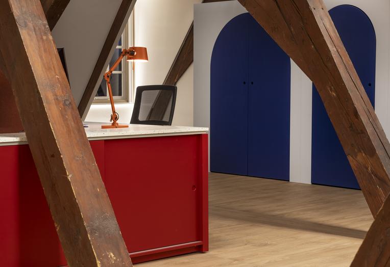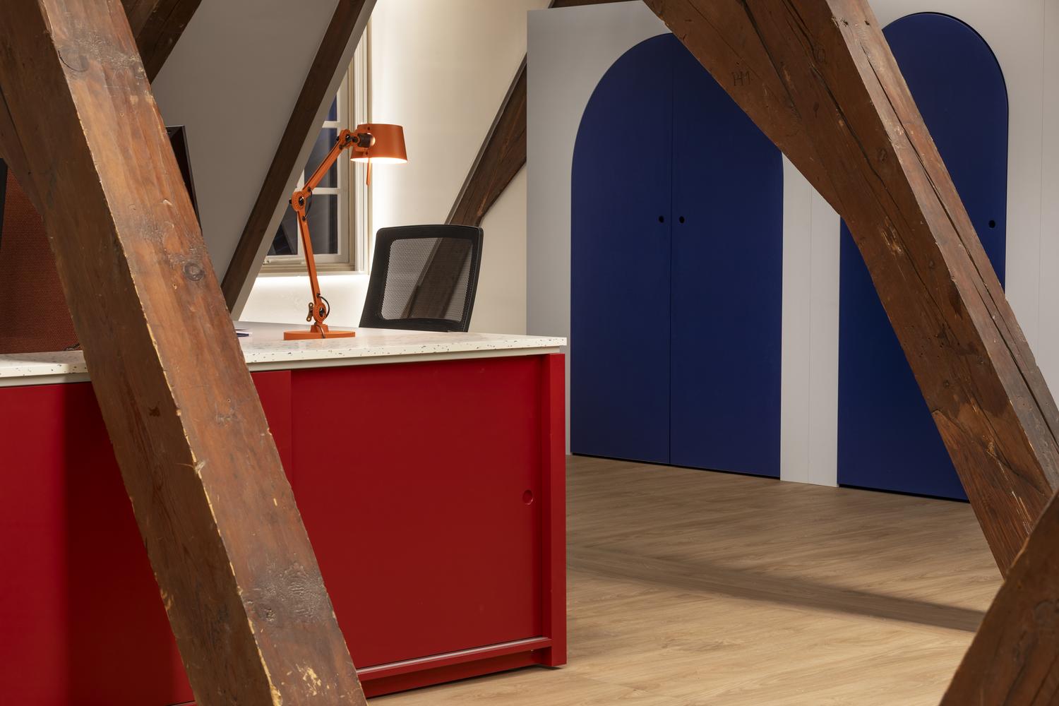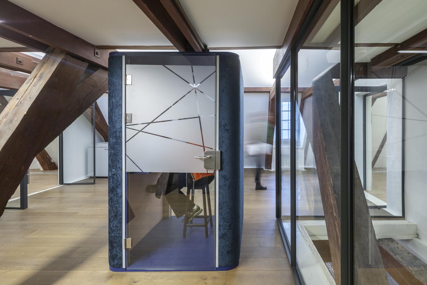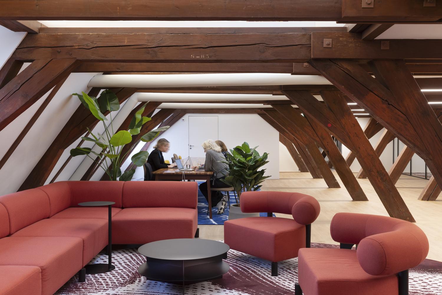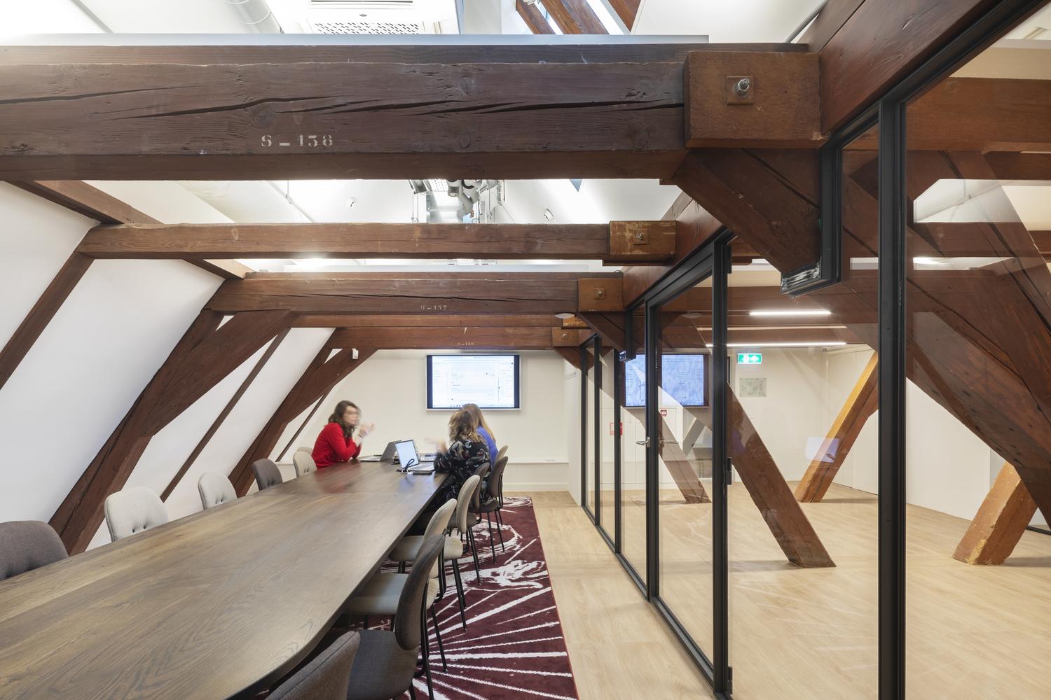 Het gebouw is architectonisch opgebouwd uit vier kwadranten die oorspronkelijk van elkaar waren gescheiden. Deze opdeling is losgelaten om meer transparantie en onderlinge verbondenheid te creëren. Door het doorbreken van fysieke barrières loopt de dakkap nu als één geheel door en staan de verschillende werkgebieden visueel met elkaar in contact. De markante balkenconstructie vormt het uitgangspunt voor de ruimtelijke opzet. Door looppaden onder de spanten te positioneren ontstond een dynamischer en ruimer geheel, met flexibele zones voor overleg, groen en informeel werken.